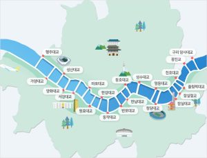 En Seúl, la capital de Corea del Sur, el río Han atraviesa la ciudad. Es uno de los más anchos del mundo (hasta 1,2 km de ancho) y 32 puentes lo cruzan, conectando sur y norte.